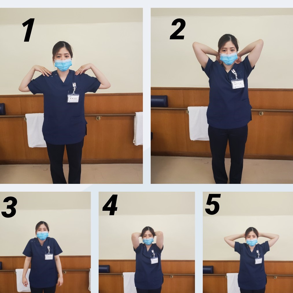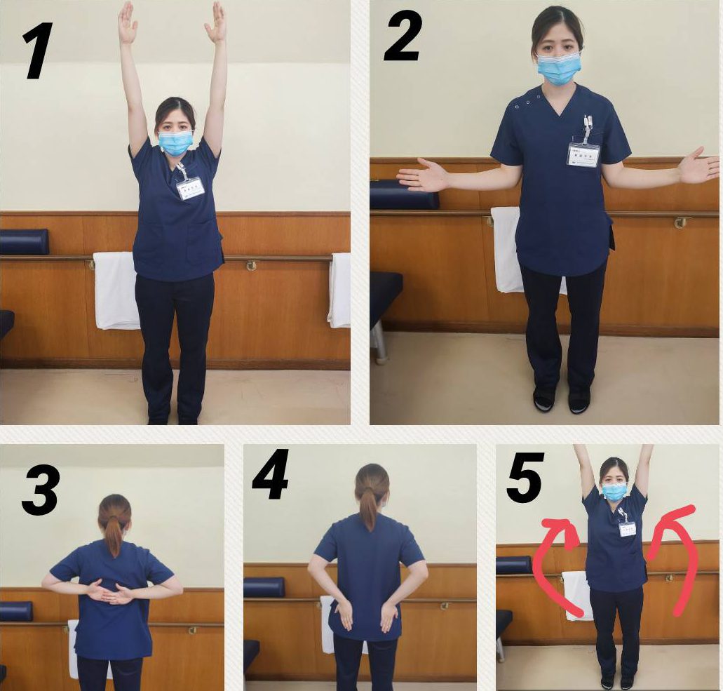 1・2)肩甲骨周囲の運動…1は開始肢位です。前から後ろに回します。この時に、肩甲骨を寄せる意識をしてみましょう。