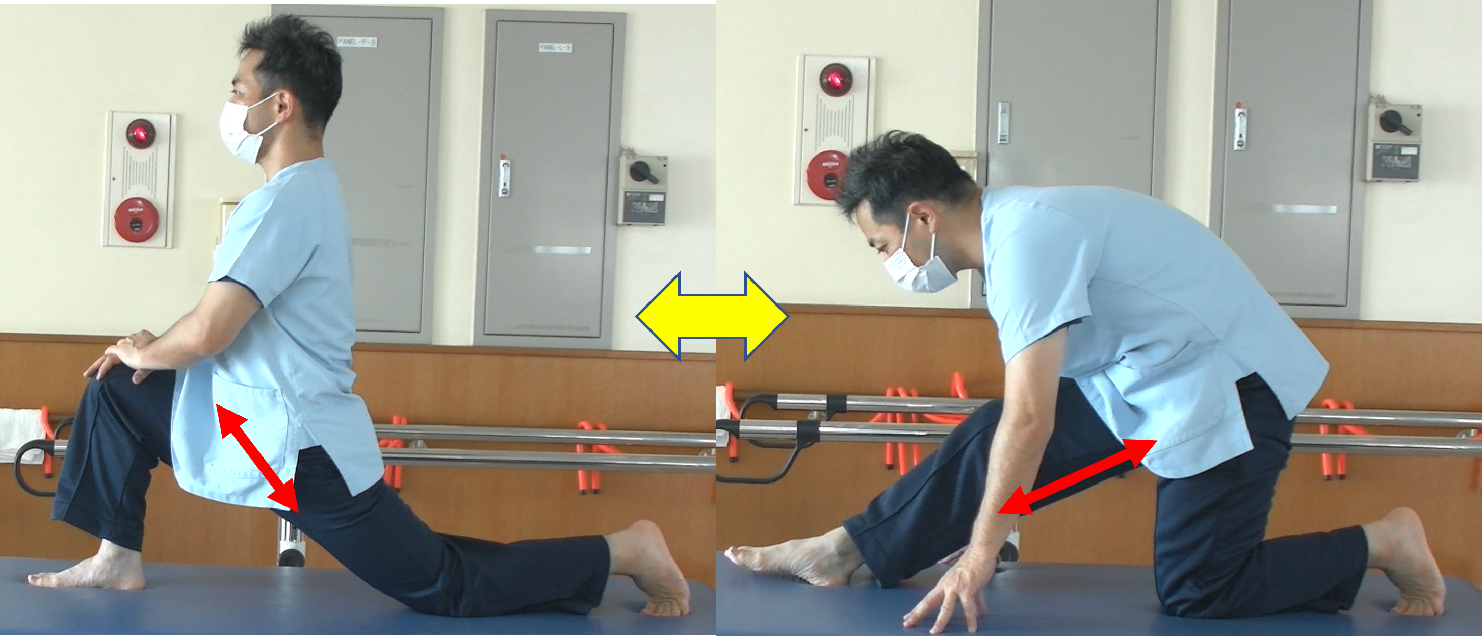 図26では、左の腸腰筋と右のハムストリングスのストレッチを交互に行っています。
