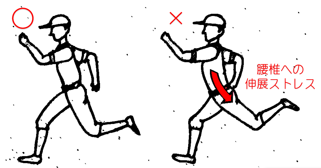 また、走塁やダッシュ動作のときに股関節屈曲(腸腰筋)をうまく使えないと、大腿四頭筋を過剰に使うことになり、大腿四頭筋の肉離れ(断裂)を生じる恐れがあります。