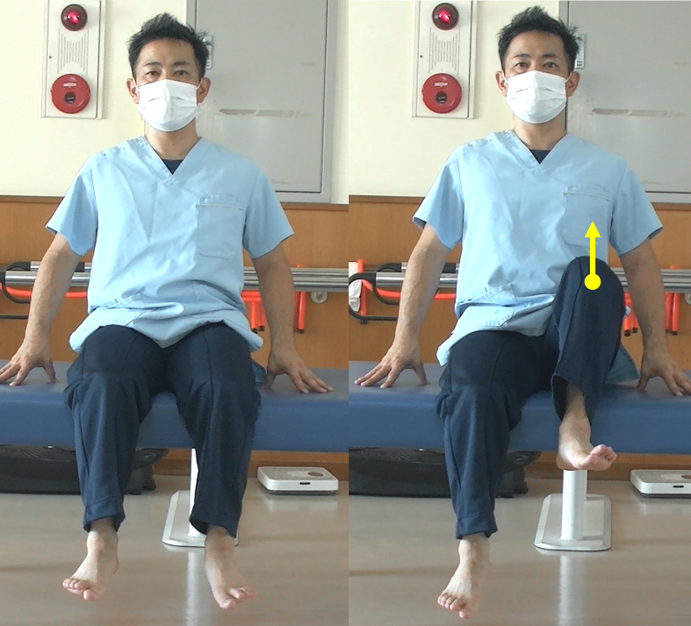 椅子に腰かけ、骨盤、体幹をまっすぐしたまま片ひざをまっすぐ上げましょう。