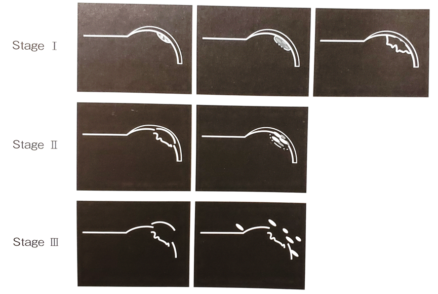 レントゲン撮影では、遊離体の有無によって、「透亮期」「分離期」「遊離期」に分けられます。
