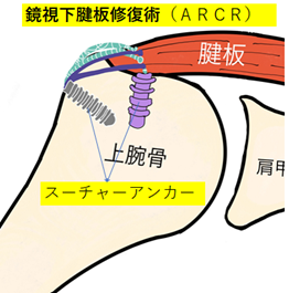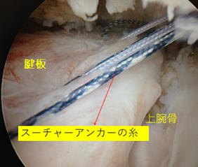 - 断裂部の断端に糸をかけ、スーチャーアンカーという器具を用いて、腱板と骨をくっつけます。(上図/写真)