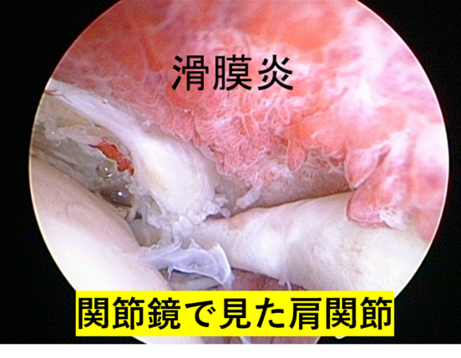 - 肩の関節の中を内視鏡で見ながら、炎症を起こしている滑膜(下図)を切除します。