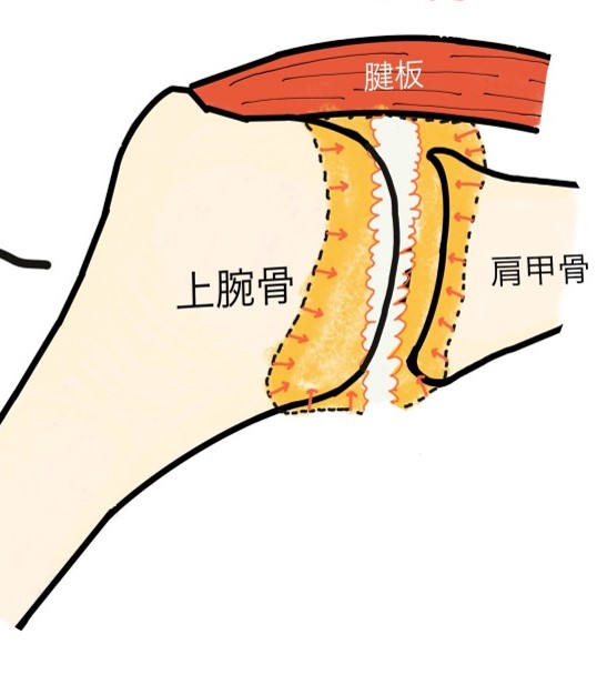 - 肩の関節の中を内視鏡で見ながら、動きが悪くなっている原因の関節包(図1)を切開(図2)します。また、炎症を起こしている滑膜を切除します。(図3)